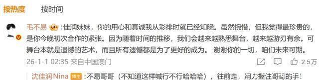 对此,毛不易在评论区回复:“佳润妹妹,你的用心和真诚我从彩排时就已经知晓。可舞台本就是遗憾的艺术,而且所有遗憾都是为了更好的成为。谢谢你的一切,咱们未来可期。” 此前报道>> 近日,据多家媒体报道,小沈阳女儿沈佳润(Nina)将于6月19日在韩国以k-popsolo歌手的身份出道,更将推出首张专辑,引发热议。 6月14日,小沈阳女儿沈佳润讲韩语的相关话题登热搜第一。
